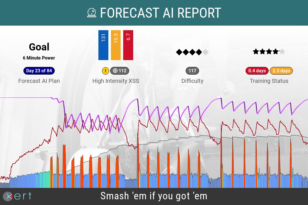 • The Forecast AI Report will display information about your training plan, the Low, High, & Peak XSS achieved (versus the targets), as well as the difficulty score and your estimated time for red or yellow status. The report will also provide an MPA chart for the activity with HR overlaid.