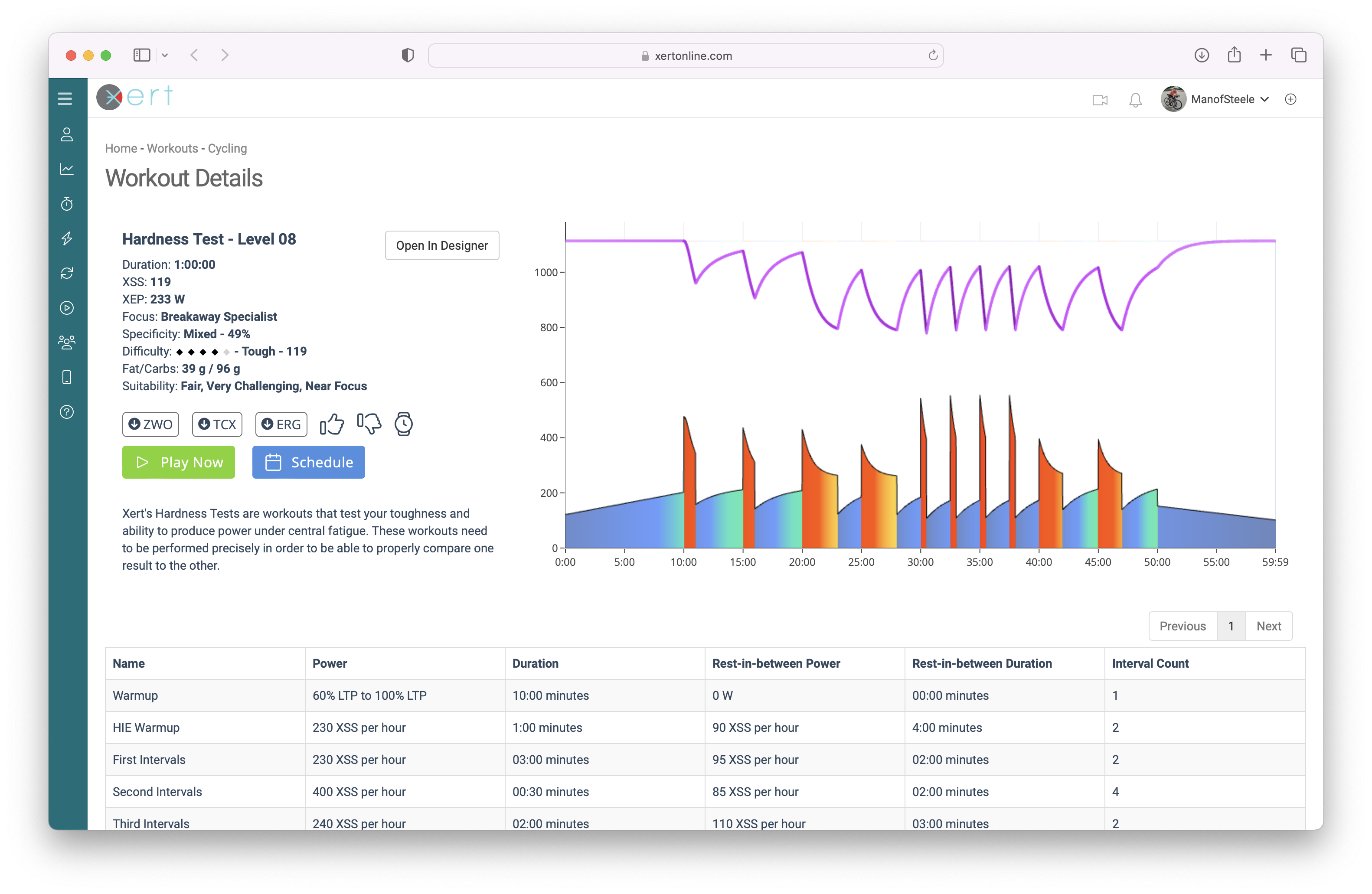 This workout would be virtually impossible to complete! Each Z5 effort would bring Clara nearly to failure before asking her to continue for 10 min just below Threshold Power. With 153 XSS in less than an hour, this might be one of the most difficult workouts Clara would have ever attempted. However, many metrics that other platforms might use, such as Weighted Average Power, Time in Zones, and Stress Score values are identical to the previous workout.