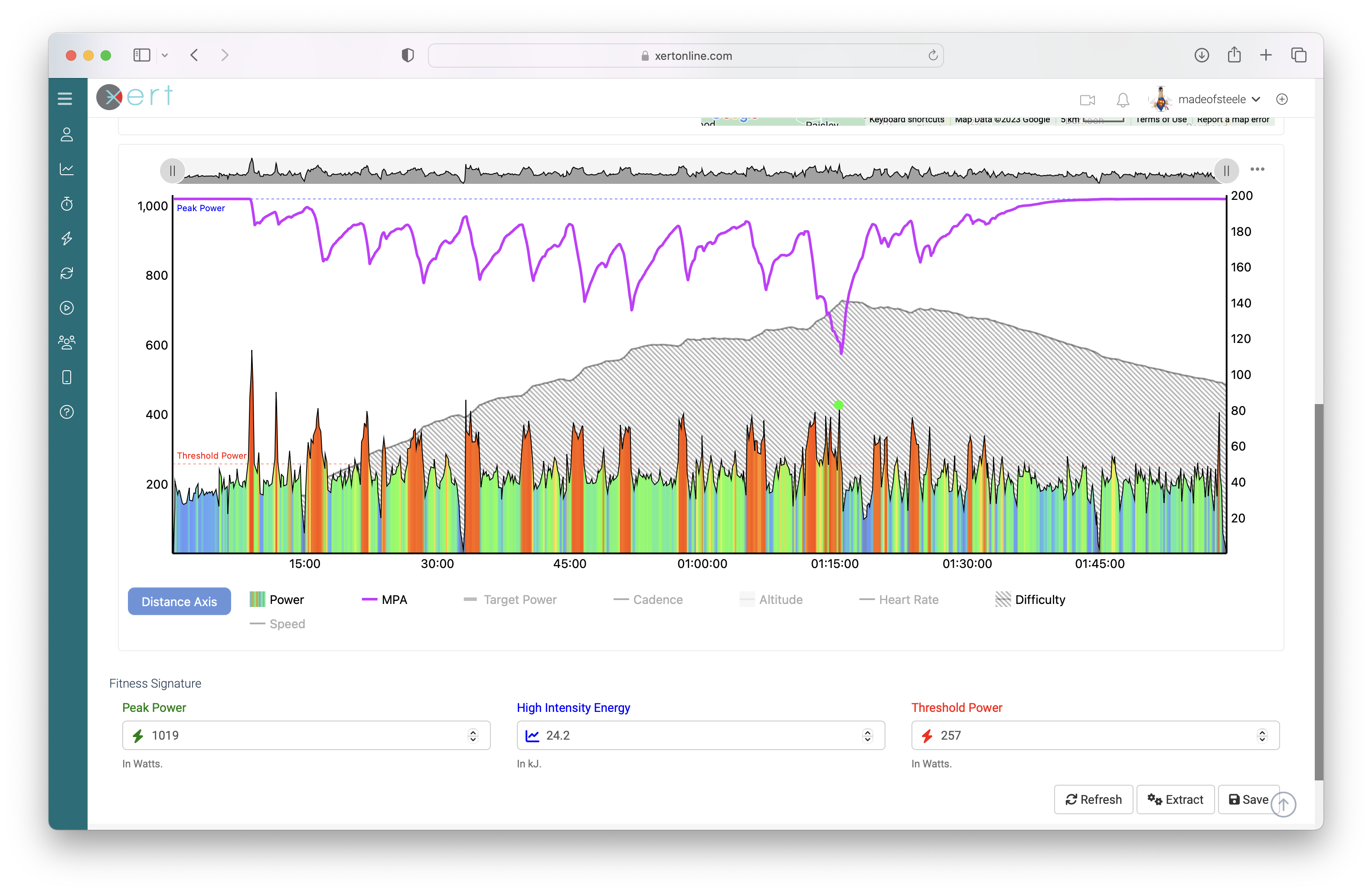We can now visualize the affect on MPA due to accumulated fatigue and recovery. We can also compare power output with MPA at a given moment. When MPA equals the athlete's power output, we have a point of maximal effort / point-of-failure, by definition. Also similarly, if the power output crosses the MPA line, the athlete's signature used to derive the MPA is too low and the athlete has achieved a fitness breakthrough.