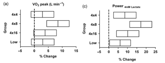 All groups of cyclists observed increases in both VO2max and power at 4mmol/L lactate. However, they found that the greatest increases were observed in the group that performed 4x8min intervals. It should be noted that, in this study, the exercises were matched for effort, not for total work performed. Therefore, the results suggest that 4×8’s provided the largest gains for a given level of effort.